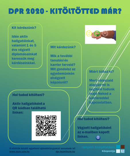 - Az 1 és 5 éve abszolvált hallgatók e-mailben kapott linken keresztül tudják a felmérést kitölteni: dpr [pont] hszk [kukac] szie [pont] hu és www.hszk.szie.hu